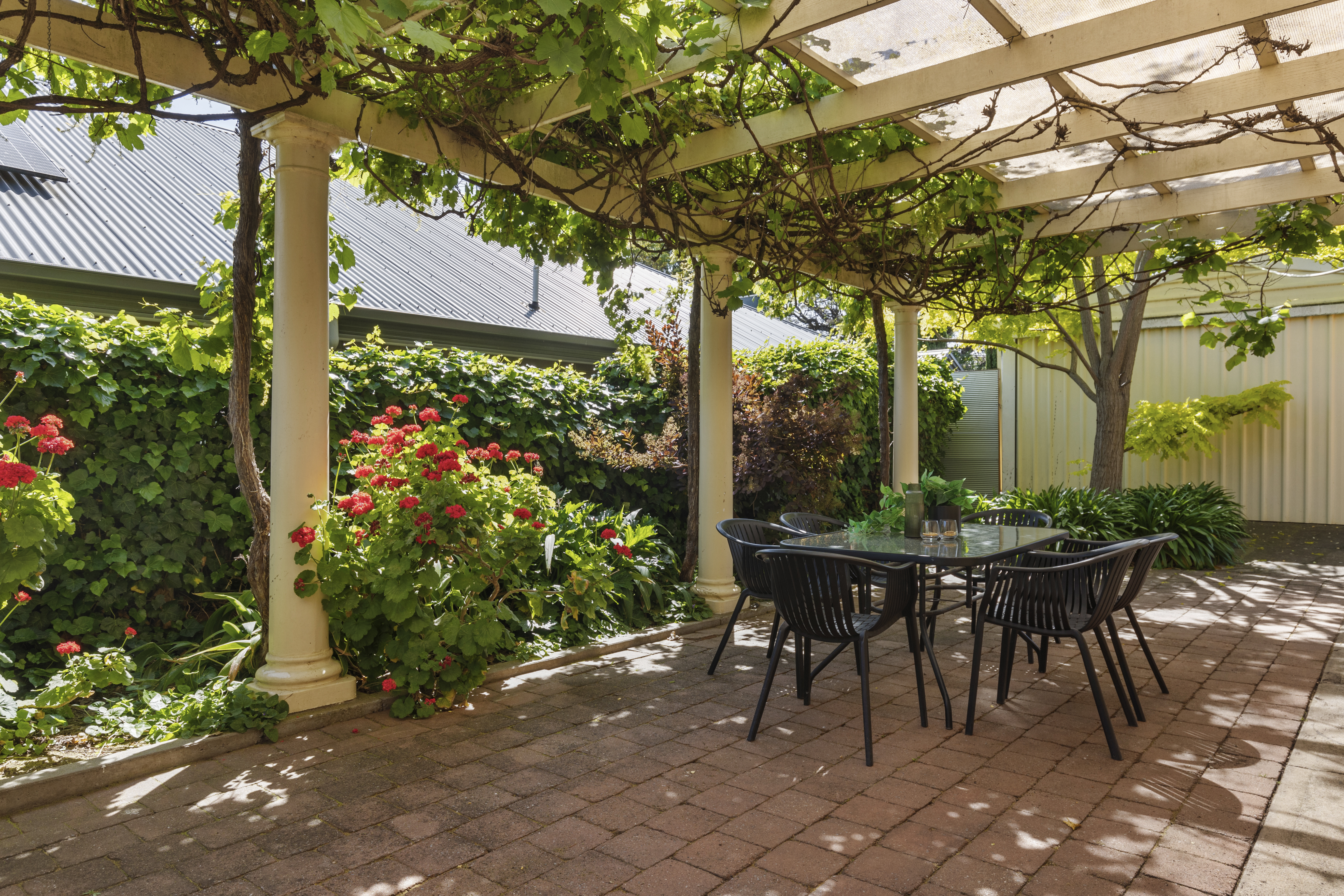 At the front of the home, the spacious formal lounge and generous master bedroom are impeccably presented, both gazing out onto the picture-book gardens. At the hub of the home, the beautifully updated kitchen will delight the cook of the household, and blends seamlessly with the adjoining dining area. From here, timber bi-fold doors lead through to the grand family room, fit to grace any home. French doors step out to a large pergola, its elegant structure and meandering vines offering a Mediterranean theme - the perfect space to enjoy a glass of wine with friends.
